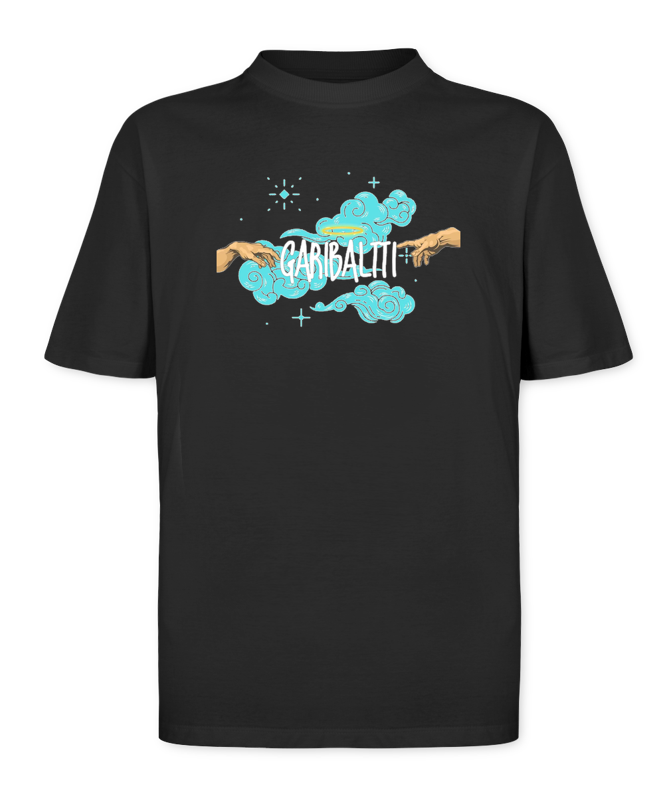 A estampa da Garibaltti é uma obra-prima divina, inspirada na icônica Criação de Adão de Michelangelo, com mãos esticadas em um toque celestial que grita “perfeição ao alcance”. Nuvens azul-turquesa rodopiam ao redor do nome GARIBALTTI em letras bold e handwritten, coroado por um halo dourado reluzente e estrelas diamantadas que adicionam um vibe mística e streetwear premium.