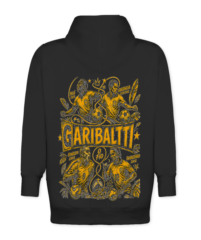 Essa estampa foi criada para quem veste orgulho, estilo e cultura. No centro, o nome Garibaltti aparece com força máxima, cercado por ícones eternos do futebol brasileiro: Pelé 1960, Garrincha 1958/1962, Ronaldo 2002 e Ronaldinho 2002. Cada traço carrega memória, talento e a energia de quem transformou o futebol em arte.