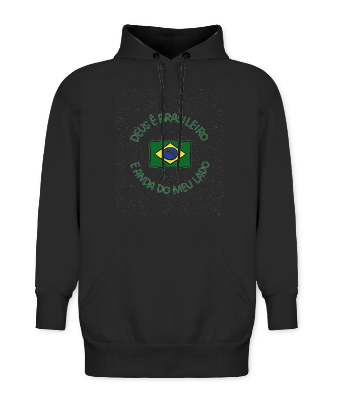 Uma frente minimalista, mas com muita presença. O símbolo central traz a bandeira em destaque, reforçando identidade, fé e orgulho nacional em uma composição simples, direta e marcante. O tipo de arte que conversa com quem gosta de vestir mensagem, estilo e personalidade sem exagero.